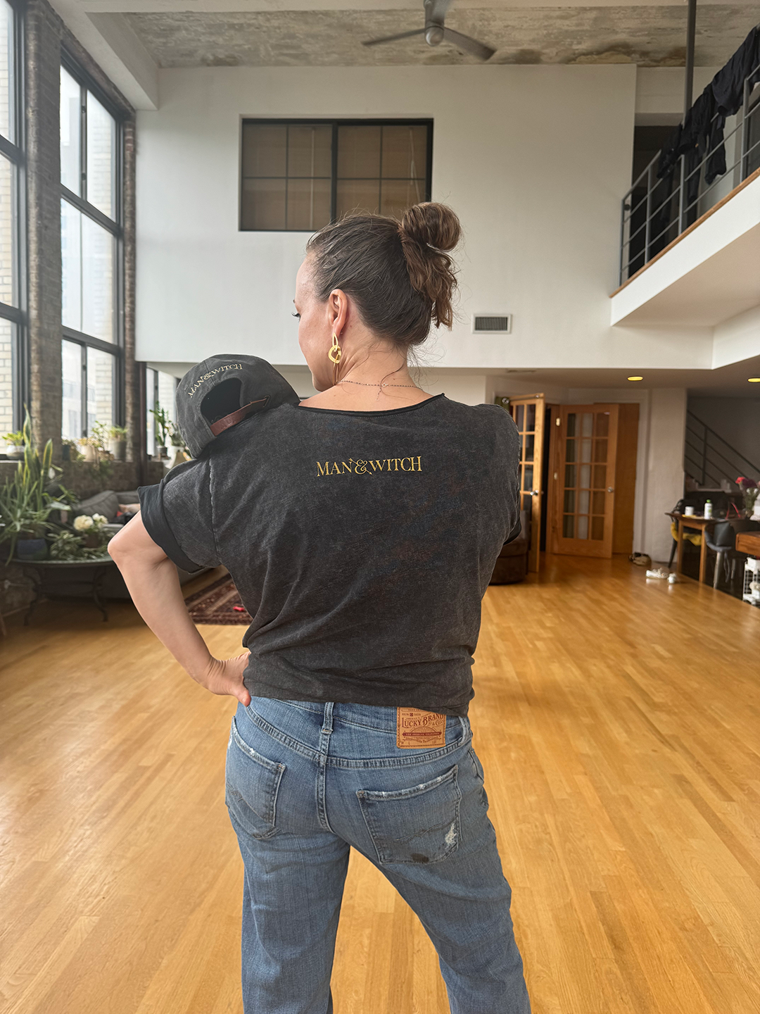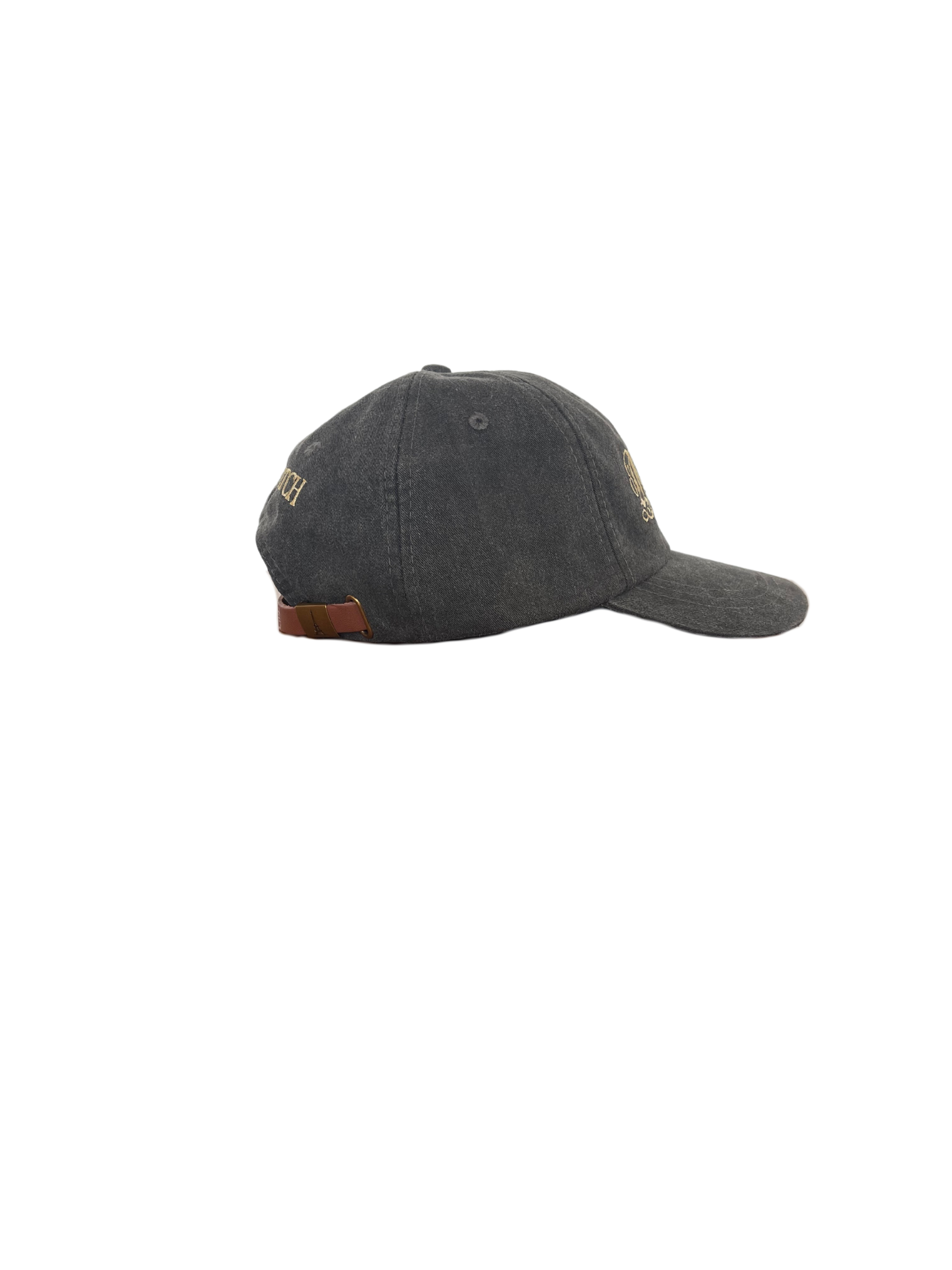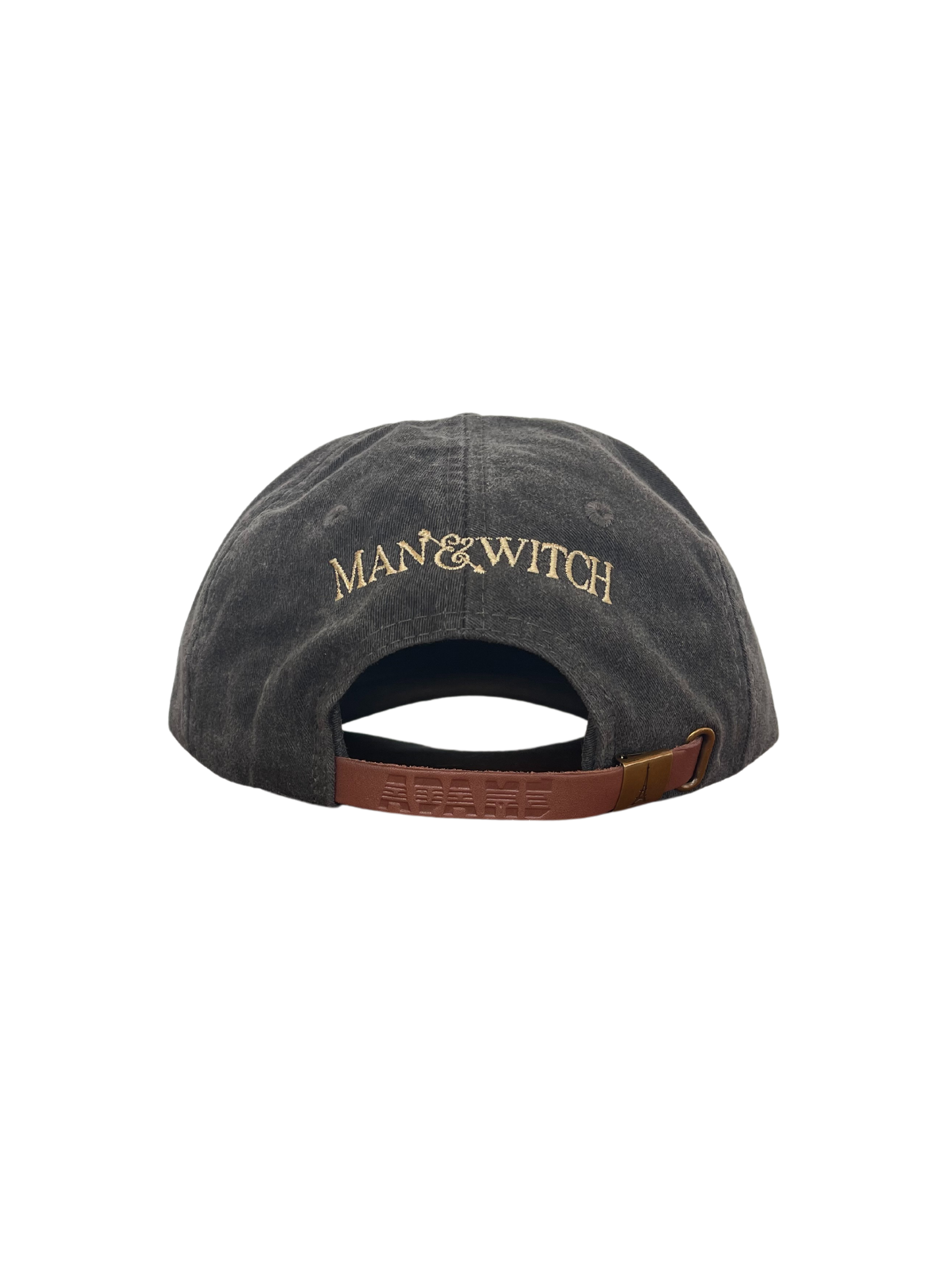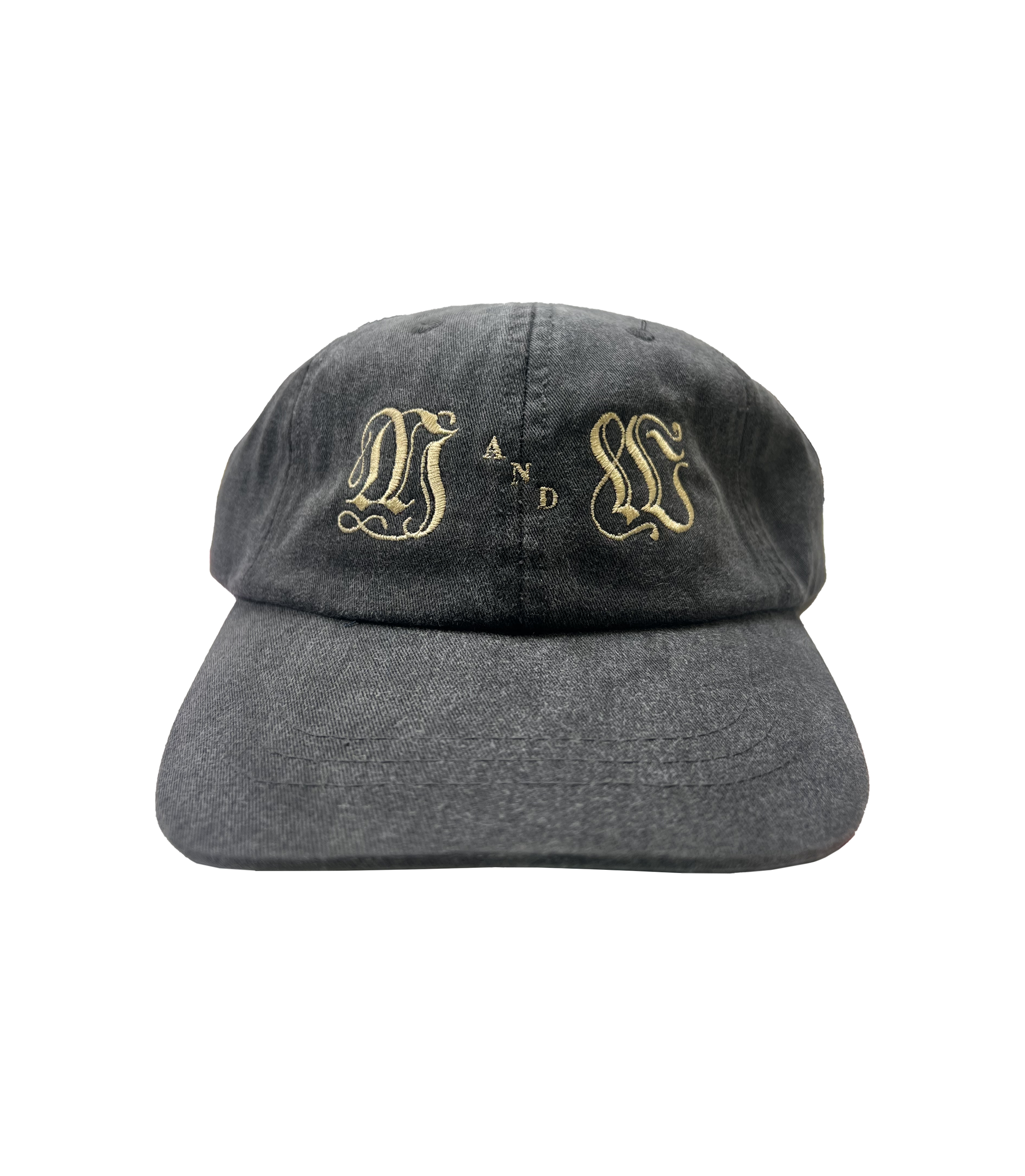 Monogram Hat: Witchy "ye olde vintage style" font on a 100% garment-washed cotton twill cap with Gold thread stitching, a leather strap and antique brass Grommet and Buckle. See if u can spot the the infinity symbol in the strokes of her quill.